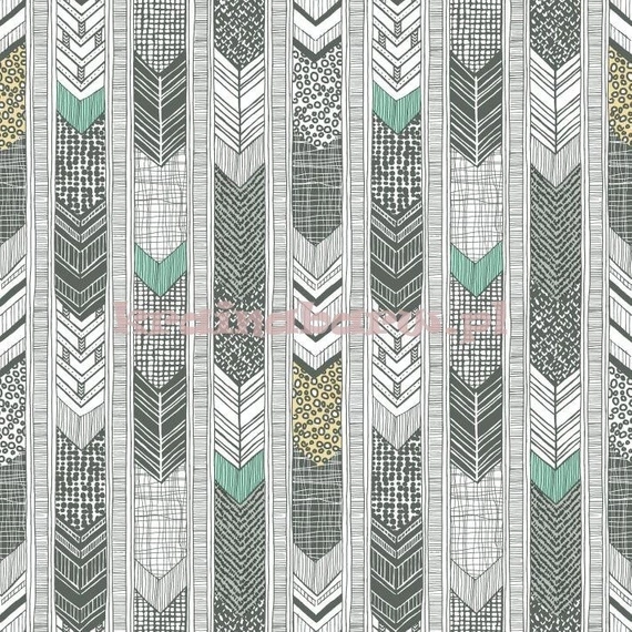 Tapeta z etnicznym geometrycznym wzorem, układającym się w pasy. Czarno biała kolorystyka z dodatkiem niebieskiego i żółtego.