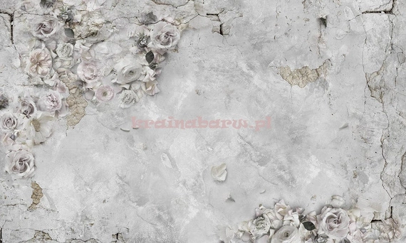 Na fototapecie w pastelowych kolorach znajdują się róże, na tle przypominającym starą ścianę.