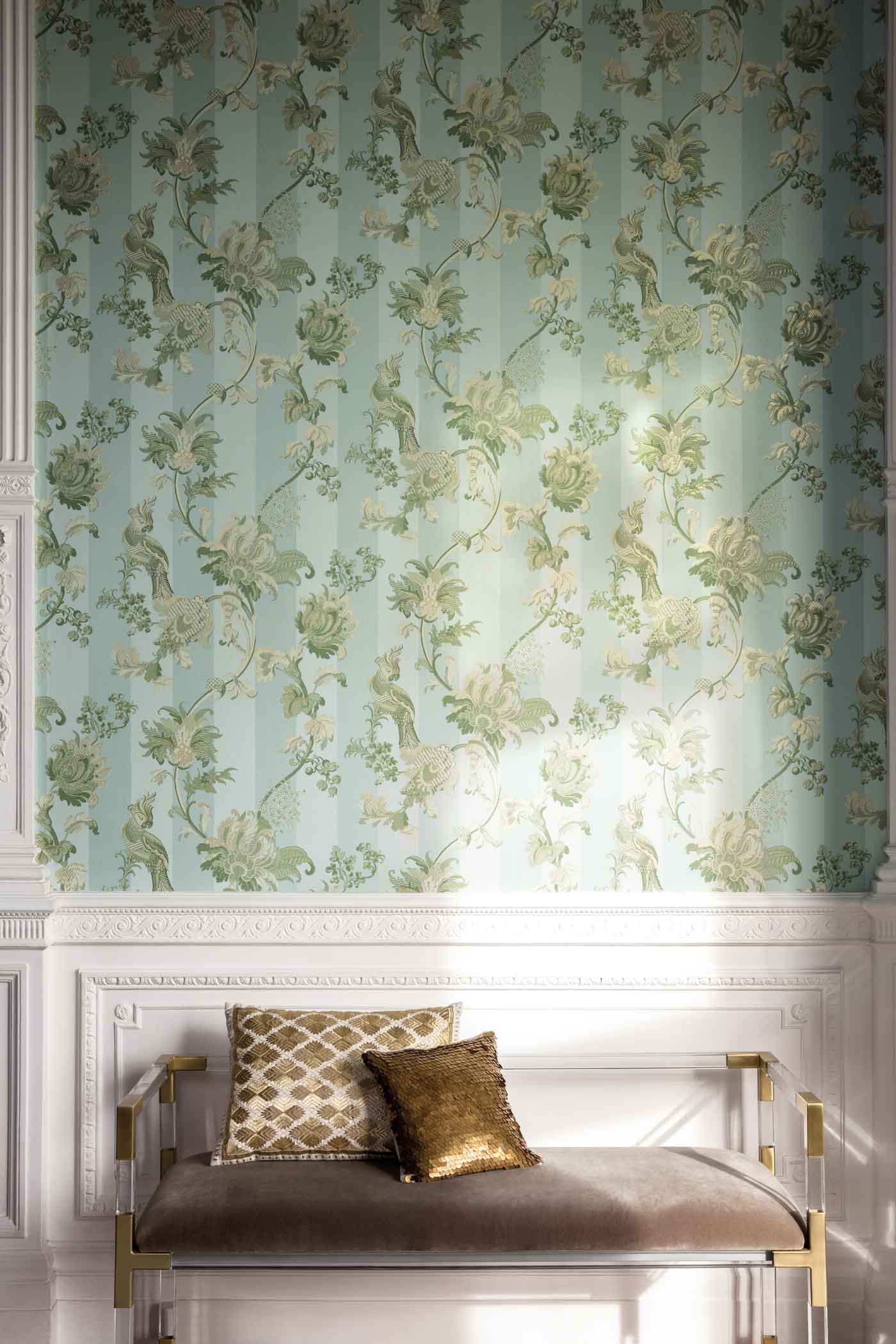 Ekskluzywne tapety ZERZURA z kolekcji Cole&Son MARTYNA LAWRENCA BULLARDA zainspirowane zostały XII wieczną legendą o rajskiej oazie na pustyni. Wejście do oazy zdobiły rzeźby dziwnych, nieznanych nikomu ptaków. Wzór z bogatymi kwiatami oraz współczesnymi papugami kakadu, poprzeplatany złotymi nićmi, sprawia wrażenie haftu. Tapeta będzie doskonałym uzupełnieniem wnętrza klasycznego, buduarowego, vintage jak również również glamur. Połączenie matu z metalicznym połyskiem nada wnętrzu stylowej, wyrafinowanej i romantycznej elegancji. Wzór dostępny jest w pięciu zestawach kolorystycznych.