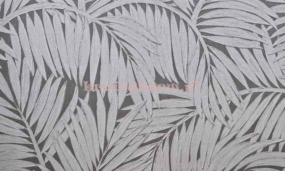 Tapeta z dużymi srebrzystmi liśćmi palmy z wyczuwalną strukturą na szarym tle