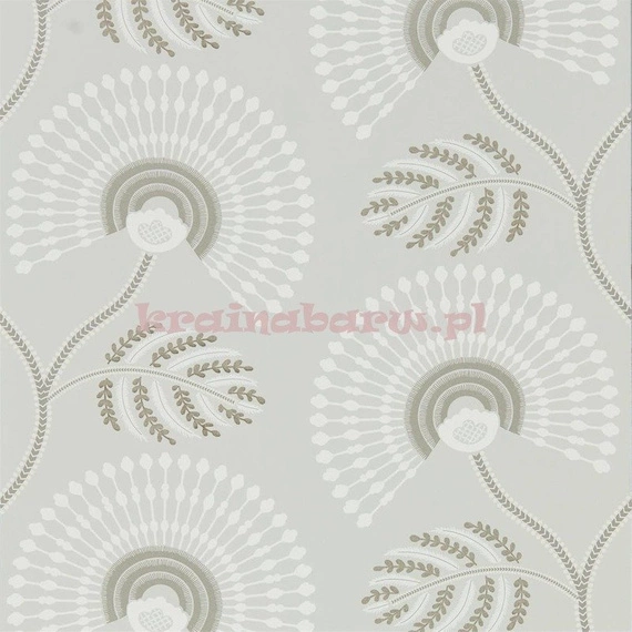 LOUELLA to nowoczesna klasyczna tapeta z kolekcji Paloma z wzorem pięknych kwiatostanów w formie wachlarza z metalicznymi , połyskującymi listkami. Subtelna elegancja nada dobrego smaku każdemu pomieszczeniu.