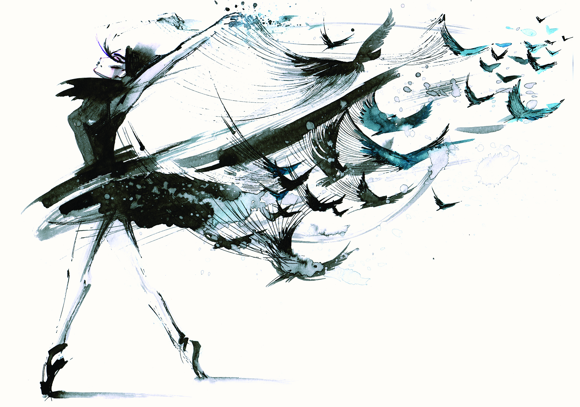 Dziewczyna, Kruki, Ptaki, Abstrakcja;Sztuka;Rysunek