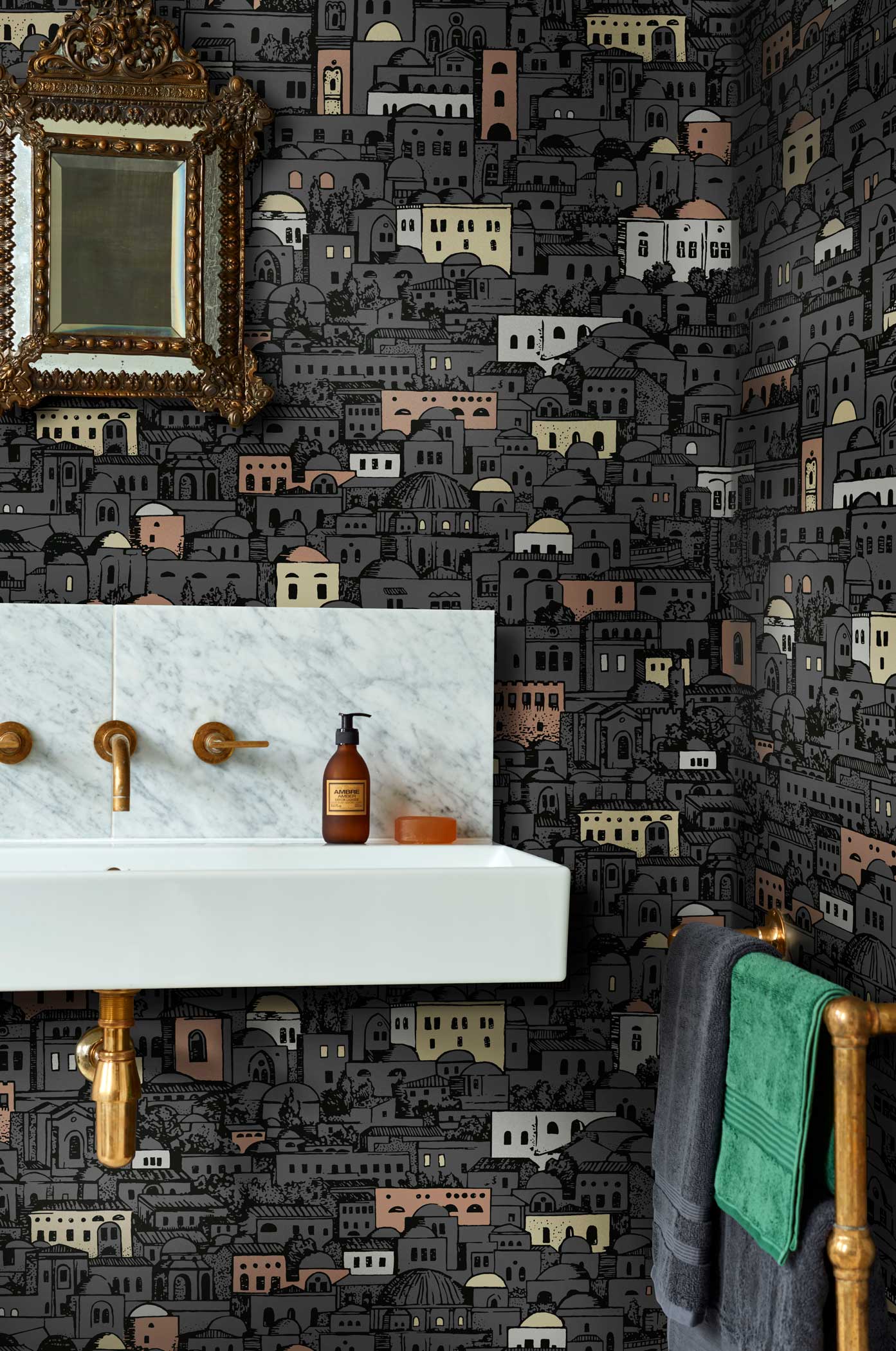 Aranżacja przedstawia tapetę z z kolekcji Cole & Son Fornasetti 114/7014 Mediterranea