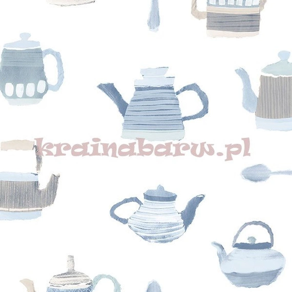Gładka tapeta z niebieskimi, beżowymi czajniczkami na białym tle