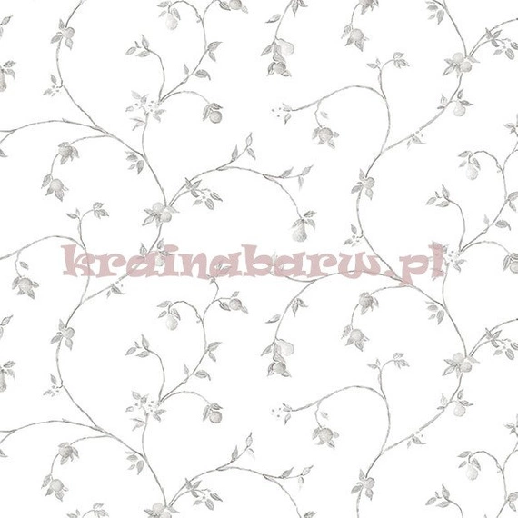 Tapeta z szarym motywem roślinnym z drobnymi owocami na białym tle