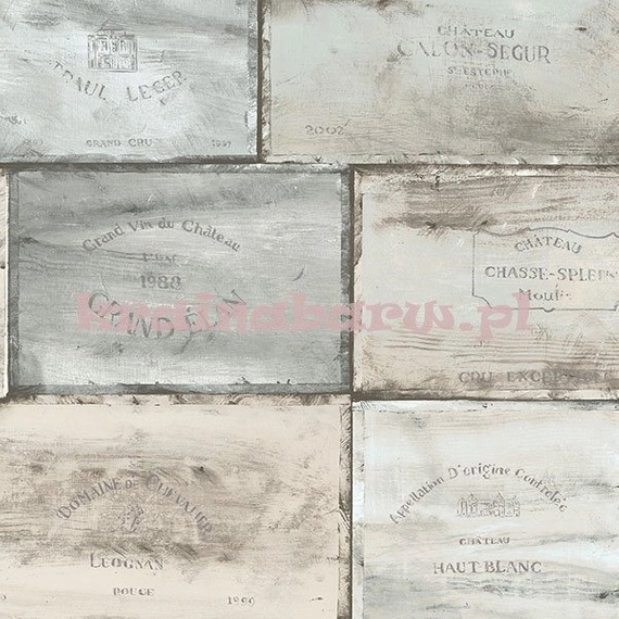 Tapeta niebiesko zielone beżowe drewniane skrzynki na wino z napisami