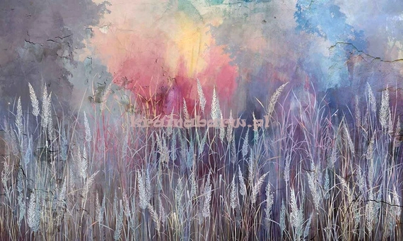 Duże kwitnące trawy w pięknych przenikających się kolorach, z przebijającym w tle słońcem,