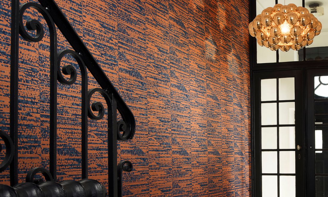 Nowoczesna geometryczna połyskująca tapeta w granatach metalicznym pomarańczu w stylu Art Deco