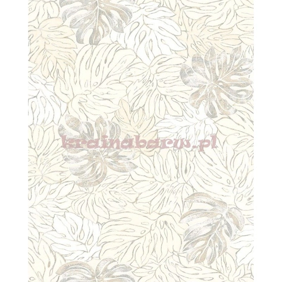 winylowa zmywalna tapeta z kolekcji Casual firmy Marburg z modnym dużym wzorem liści tropikalnej rośliny monstery(znanej również pod nazwa filodendron). Piękna struktura,wyczuwalnych w dotyku, zachodzących na siebie liści sprawia wrażenie efektu 3D. Wzór w tonacji jasnych piaskowych beży, kremów z delikatnie połyskującymi perłowo konturami liści i metalicznie połyskującym ciemniejszym akcentem, doskonale wpisuje się w modny styl w aranżacji wnętrz zwany „miejską dżunglą”, ożywi i ociepli minimalistyczne wnętrze, również sprawdzi się we wnętrzach w stylu retro, art deco, glamour.