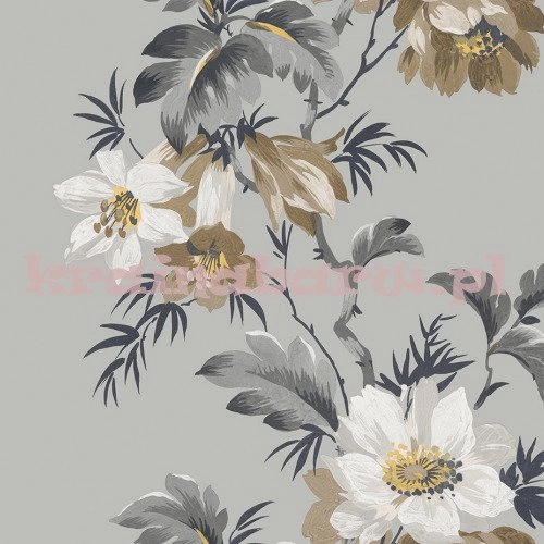 tapeta z motywem dużych egzotycznych kwiatów, sprawia wrażenie ręcznie malowanych. Na matowym szarym tle przebiega również matowy wzór tropikalnych kwiatów w odcieniach szarości i beży. Luksusowa tapeta z modnym kwiatowym wzorem nada każdemu wnętrzu stylowej elegancji.