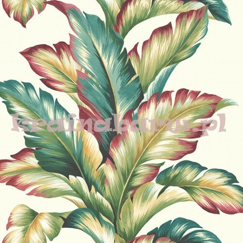 tapeta z motywem dużych tropikalnych kolorowych liści, umieszczonych na białym matowym tle. Wzór sprawia wrażenie ręcznie malowanego, z efektem głębi i przestrzeni. Efektowna tapeta z botanicznym wzorem nada każdemu wnętrzu modnej stylowej elegancji.