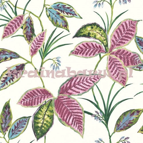 tapeta z matowym motywem dużych egzotycznych liści w odcieniach różu, niebieskiego, fioletu, zieleni, umieszczonych na białym matowym tle. Wzór sprawia wrażenie ręcznie malowanego, z efektem głębi i przestrzeni. Imponująca tapeta z botanicznym wzorem nada każdemu wnętrzu modnej stylowej elegancji.