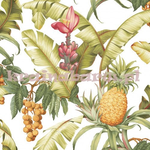 matowa tapeta z tropikalnymi liśćmi w odcieniach zieleni, z różowo czerwonymi kwiatami, brązowo pomarańczowymi owocami ananasów na białym tle. Efektowna tapeta z botanicznym wzorem nada każdemu wnętrzu modnej stylowej elegancji oraz wprowadzi w nim pogodny nastrój.