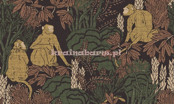 Nowoczesna tapeta z małpkami wśród drzew w brązach złocie zieleni