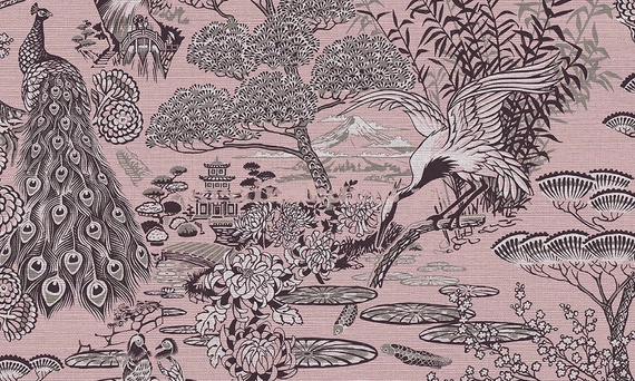 tapeta ma szerokość 1 metra i długość 10,05 metra. To orientalna podróż, przedstawiającą rajskie ptaki, pawie i lilie w japońskim ogrodzie. Malownicza tapeta, z wyczuwalną w dotyku strukturą przypominającą w dotyku płótno, jest w odcieniach stonowanego, brudnego różu, bordo, oliwki, bieli. Elegancka, doskonałej jakości tapeta, będzie niezwykle efektowną ozdobą współczesnego wnętrza w stylu japońskim, orientalnym, minimalistycznym, nowoczesnym.