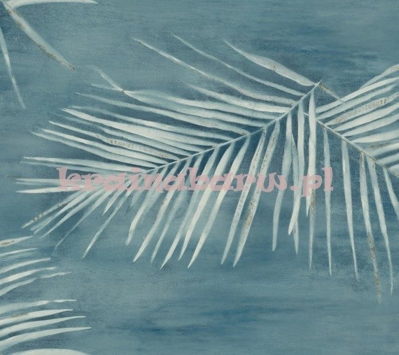 rolka ma długość:10.1mb, szerokość:45.7cm, oraz pasowanie wzoru co 61cm. Luksusowa tapeta z w malowniczym, imponującym wzorem liści palmy w rozbielonym niebieskim kolorze, miejscami ozdobionych delikatnym metalicznym akcentem, umieszczonych na cieniowanym ciemniejszym tle w odcieniach koloru niebieskiego, granatu. Elegancka tapeta z tropikalnym wzorem, to modny i stylowy akcent w salonie, jadalni, sypialni, gabinecie.