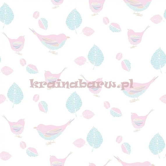 rolka ma długość 10,05m, szerokość 53cm, oraz pasowanie wzoru co 53cm. Tapeta z sympatycznymi ptaszkami, oraz drobniejszymi listkami i piórkami w pastelowych różowo niebieskich kolorach, umieszczonych na białym tle. Urzekająca, pełna wdzięku tapeta, stworzy w pokoju dziecka pogodny i ciepły klimat.