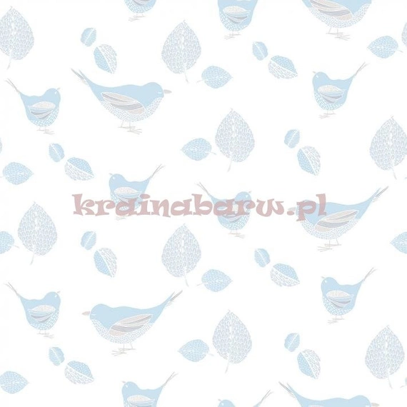 rolka ma długość 10,05m, szerokość 53cm, oraz pasowanie wzoru co 53cm. Tapeta z sympatycznymi ptaszkami, oraz drobniejszymi listkami i piórkami w pastelowym odcieniu koloru niebieskiego. Ptaszki mają miejscami beżowe i dyskretnie zaakcentowane, połyskujące srebrzyście piórka. Wzory umieszczone są na białym tle. Urzekająca, pełna wdzięku tapeta, stworzy w pokoju dziecka niezwykle pogodny i ciepły klimat.