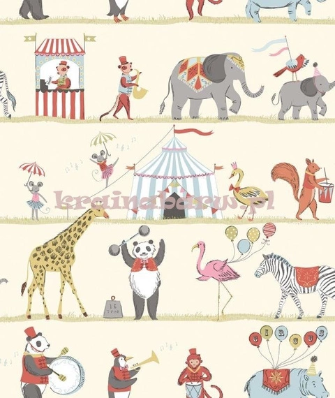 rolka ma długość 10,05m, szerokość 53cm, oraz przesunięcie wzoru co 63cm. Tapeta z zabawnymi zwierzątkami w cyrku. Znajdziemy tu słonie, pandy, żyrafy, strusie, małpy, zebry, pingwiny, myszki i inne. Zwierzątka są w stonowanych kolorach, przyjemnych kolorach, umieszczone są na rozbielonym jasno beżowym tle. Zaczarowany świat cyrku z wesołą paradą grających na instrumentach zwierząt, ubranych w cyrkowe ubrania, z kolorowymi balonikami, wspaniale wpisuje się w dziecięcy świat zabaw i w aktualne trendy w aranżacji wnętrz w stylu retro, vintage.