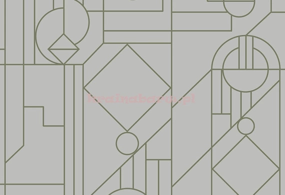 rolka ma długość 10mb, szerokość 53cm, oraz pasowanie wzoru co 64/32cm. Tapeta zainspirowana stylem Art Deco. Geometryczne figury, koła i trójkąty tworzą intrygujący widok podkreślony lekko wyczuwalnymi w dotyku, połyskującymi brokatowymi złocisto-zielonymi konturami. Wzór umieszczonymi na matowym szarobeżowym tle. Luksusowa, pełna elegancji tapeta idealnie pasuje do współczesnych nowoczesnych wnętrz.