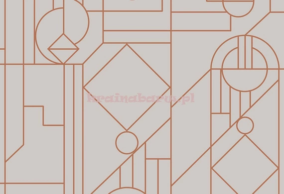 rolka ma długość 10mb, szerokość 53cm, oraz pasowanie wzoru co 64/32cm. Tapeta zainspirowana stylem Art Deco. Geometryczne figury, koła i trójkąty tworzą intrygujący widok, podkreślony lekko wyczuwalnymi w dotyku połyskującym iw kolorze miedzi brokatowymi konturami. Wzór umieszczony jest na matowym beżowym tle. Luksusowa, pełna elegancji tapeta idealnie pasuje do współczesnych nowoczesnych wnętrz.