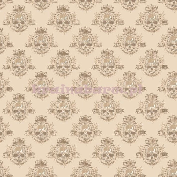 rolka ma długość 10,05m, szerokość 53cm, oraz przesunięcie wzoru co 13.25cm. Tapeta z wzorem rockowej czaszki w brązie i złotym, oraz  napisami w języku angielskim: GRUNGE, STAY TRUE , YOUR CHOICE, YOUR RULES, umieszczonymi na beżowym matowym tle. To stylowe i oryginalne uzupełnienie pokoju młodzieżowego, miłośnika rocka, wnętrz w stylu grunge, w klimacie industrialnym, nowoczesnym.
