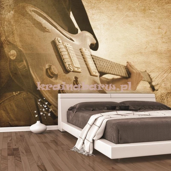 Nowoczesny, doskonałej jakości obraz z gitarzystą i gitarą elektryczną, utrzymany w odcieniach brązów, kremów, kolorów sepii. To stylowe i oryginalne uzupełnienie pokoju młodzieżowego, fana muzyki,rocka, stylu grunge, wnętrz w klimacie industrialnym, nowoczesnym, vintage.