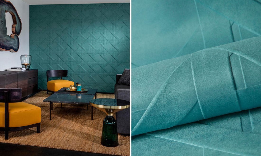 Tapeta sprzedawana na metry bieżące, ma szerokość 125cm, pasowanie wzoru co 31,25 cm. Ekskluzywna tapeta w odcieniu szmaragdowej zieleni, miękka w dotyku z grubą strukturą przypomina naturalną zamszową skórę. Geometryczny motyw zainspirowany plecionkami z ratanu lub trzciny układa się w imponujący duży wzór. Wyczuwalna w dotyku struktura tworzy wspaniały efekt 3, oraz stwarza w pomieszczeniu pozytywny efekt akustyczny. Oryginalna i zjawiskowa tapeta to doskonałe i luksusowe uzupełnienie nowoczesnych salonów, sypialni, gabinetów, pokoi telewizyjnych, multimedialnych oraz innych prestiżowych wnętrz.