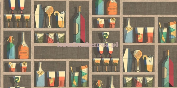 rolka ma długość 10m, szerokość 68,5cm, pasowanie wzoru co 68,5cm. Stylizowane graficzne butelki, szkło z koktajlami, stojące na półkach w harmonijnym porządku. Kolorowa tapeta w pastelowych odcieniach koloru beżowego, niebieskiego, czerwonego, zielonego, to znany wzór stworzony przez Piero Fornasettiego w latach 50 XX wieku. Doskonałej jakości luksusowa tapeta z realistyczną, znakomitą grafiką, wprowadzi pogodny, pozytywny, a zarazem oryginalny klimat w jadalni, kuchni, salonie,w barach, loftach, w nowoczesnych wnętrzach w stylu skandynawskim, minimalistycznym, vintage, retro.