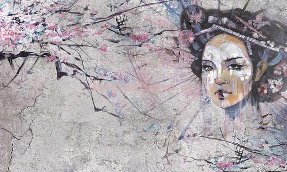 Ekskluzywna nowoczesna fototapeta kwitnące wiśnie z gejszą YOKO