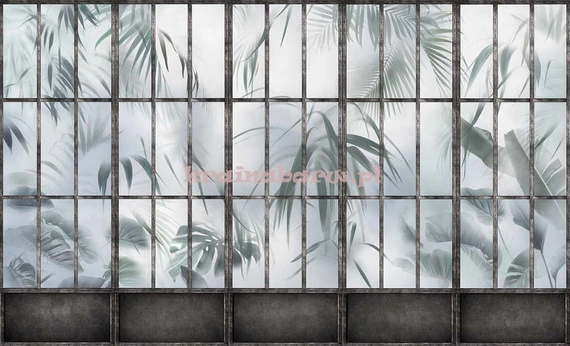 Fototapeta z modnym motywem tropikalnego ogrodu. Liście palmy, monstery w odcieniach popieli, szarości, zieleni, ukryte za dużym oknem z kratownicą , sprawiają naturalne wrażenie ogrodu, spowitego we mgle. Niezwykła pastelowa kolorystyka i oryginalny wzór, będzie malowniczym nowoczesnym i eleganckim uzupełnieniem każdego wnętrza.