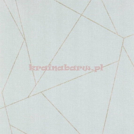 Wysokiej jakości winylowa tapeta na podłożu papierowym ma szerokość 68,5cm, długość 10,05 metra, pasowanie wzoru co 76,2cm. Modna nowoczesna tapeta z połyskującymi metalicznie złocistymi liniami, przecinającymi się pod różnymi kątami, tworzącymi duże imponujące wzory z trójkątami, wielokątami. Wzór umieszczony jest na prostym tle przypominającym płótno, w odcieniu koloru beżowego z nutką szarości. To oryginalny, wzór, który w zjawiskowy sposób ozdobi wnętrza najbardziej wymagających klientów.