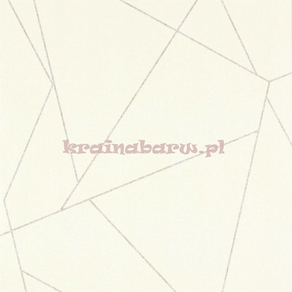 Wysokiej jakości winylowa tapeta na podłożu papierowym ma szerokość 68,5cm, długość 10,05 metra, pasowanie wzoru co 76,2cm. Modna nowoczesna tapeta z połyskującymi metalicznie liniami, przecinającymi się pod różnymi kątami, tworzącymi duże imponujące wzory z trójkątami, wielokątami. Wzór umieszczony jest na prostym tle przypominającym płótno, w odcieniu koloru kremowego. To oryginalny, wzór, który w zjawiskowy sposób ozdobi wnętrza najbardziej wymagających klientów.
