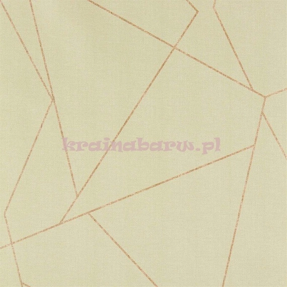 Wysokiej jakości winylowa tapeta na podłożu papierowym ma szerokość 68,5cm, długość 10,05 metra, pasowanie wzoru co 76,2cm. Modna nowoczesna tapeta z połyskującymi metalicznie liniami, przecinającymi się pod różnymi kątami, tworzącymi duże imponujące wzory z trójkątami, wielokątami. Wzór umieszczony jest na prostym tle przypominającym płótno, w odcieniu koloru beżowego. To oryginalny, wzór, który w zjawiskowy sposób ozdobi wnętrza najbardziej wymagających klientów.
