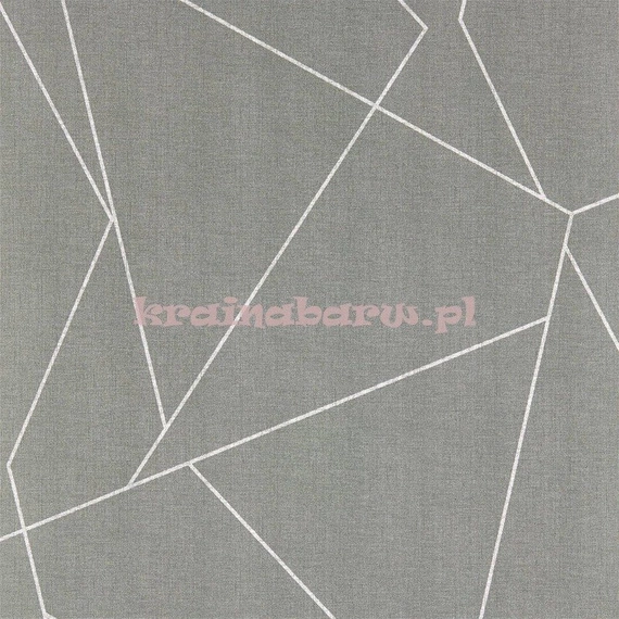 Wysokiej jakości winylowa tapeta na podłożu papierowym ma szerokość 68,5cm, długość 10,05 metra, pasowanie wzoru co 76,2cm. Modna nowoczesna tapeta z połyskującymi metalicznie liniami, przecinającymi się pod różnymi kątami, tworzącymi duże imponujące wzory z trójkątami, wielokątami. Wzór umieszczony jest na prostym szarym tle przypominającym płótno. To oryginalny, wzór, który w zjawiskowy sposób ozdobi wnętrza najbardziej wymagających klientów.