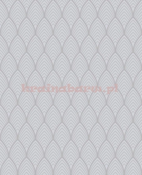 Rolka ma szerokość 53cm, długość 10,05 metra,pasowanie wzoru co 12,8cm. To tapeta z modnym regularnym geometrycznym wzorem, stylizowanych liści, na szarym matowym tle. Prosty wyczuwalny w dotyku połyskujący srebrzyście wzór z elegancją wpisuje się do współczesnych wnętrz, nadając im luksusowego blasku.