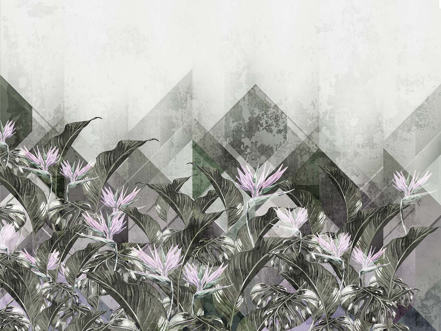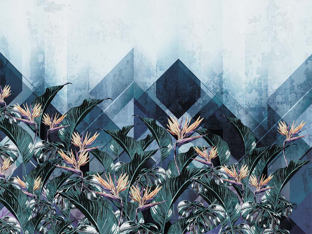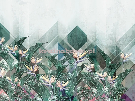 Duże liście tropikalnych roślin i kwitnących kwiatów, na tle dużych geometrycznych wzorów w