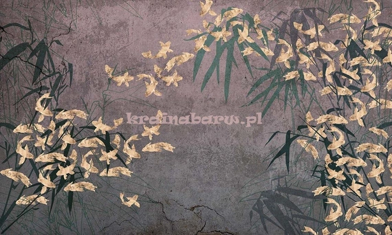 Fototapeta z nowoczesną grafiką, z wyczuwalną w dotyku strukturą, w modnym orientalnym klimacie. Małe ozdobne karpie Koi Taki Asagi zgrabnie pływają wśród bambusowych gałązek. Wzór umieszczony jest na tle przypominającym betonową, miejscami otynkowaną ścianę. Całość utrzymana w odcieniach szarości, beży, zieleni. Zjawiskowa, doskonałej jakości fototapeta, będzie niezwykle efektowną i elegancką ozdobą współczesnego wnętrza w stylu japońskim, orientalnym, minimalistycznym, nowoczesnym.