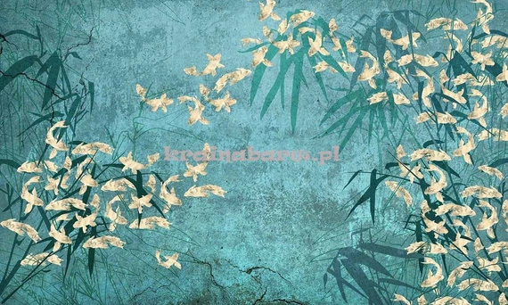 Fototapeta z nowoczesną grafiką, z wyczuwalną w dotyku strukturą, w modnym orientalnym klimacie. Małe ozdobne karpie Koi Taki Asagi zgrabnie pływają wśród bambusowych gałązek. Wzór umieszczony jest na tle przypominającym betonową, miejscami otynkowaną ścianę. Całość utrzymana w odcieniach koloru niebieskiego, beży, zieleni. Zjawiskowa, doskonałej jakości fototapeta, będzie niezwykle efektowną i elegancką ozdobą współczesnego wnętrza w stylu japońskim, orientalnym, minimalistycznym, nowoczesnym.
