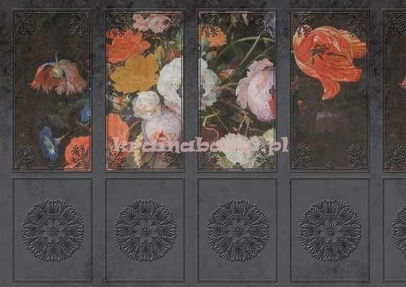 Wzór z kolekcji CLassic, inspirowany wielką sztuką. Tapeta powstała z połączenia zdjęć zdobnych sztukaterii, z zabytkowych pałacy i dworków oraz reprodukcji obrazu XVIII w malarza. Zaproś sztukę do swojego wnętrz. Tapeta jest niezwykle zdobna i wspaniałe prezentuje się na strukturze betonu oraz srebnego lnu dodając wnętrzu elegancji.
