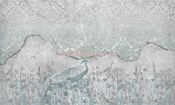 Fototapeta z nowoczesną grafiką, w dotyku lekko chropowata, sprawiająca wrażenie głębi i przestrzeni. Fototapeta przypomina ścianę z kaflami z pięknym ornamentowym wzorem, spod tynku wyłania się łąka z kwiatami, trawami, ziołami i tajemniczym ptakiem, na betonowym tle z lekkimi odciskami ornamentów. Całość utrzymana w modnych odcieniach szarości tworzy zachwycający, spektakularny efekt.
