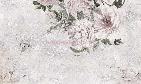 Fototapeta z nowoczesną grafiką, w dotyku lekko chropowata, sprawia wrażenie głębi i przestrzeni tworząc efekt 3D. Duże kwiaty piwonii w rozbielonych odcieniach różu, szarości, zieleni, na tle ściany z ornamentowym wzorem i widocznymi pęknięciami stworzą niezwykły klimat w Twoim wnętrzu. Fototapeta doskonale wpisuje się w modne roślinne aranżacje wnętrz.