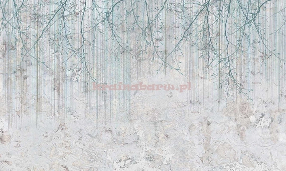 Fototapeta z nowoczesną grafiką, w dotyku lekko chropowata, sprawia wrażenie głębi i przestrzeni tworząc efekt 3D. Na szarym tle przypominającym betonową ścianę umieszczone są gałązki drzewa w odcieniach zielono niebieskich. Fototapeta doskonale wpisuje się we współczesne aranżacje, tworząc wyjątkowe, zapadające w pamięć wnętrze.