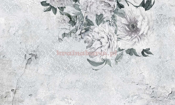 Fototapeta z nowoczesną grafiką, w dotyku lekko chropowata, sprawia wrażenie głębi i przestrzeni tworząc efekt 3D. Duże kwiaty piwonii w na tle ściany z ornamentowym wzorem i widocznymi pęknięciami stworzą niezwykły klimat w Twoim wnętrzu. Fototapeta w odcieniach koloru szarego doskonale wpisuje się w modne roślinne aranżacje wnętrz.