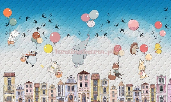 Fototapeta z nowoczesną grafiką, w dotyku lekko chropowata, sprawia wrażenie głębi i przestrzeni tworząc efekt 3D. Kolorowe baloniki ze słoniem, kotkiem, zajączkiem, liskiem, unoszą się nad kolorowymi domkami, wśród ptaków, na tle biało niebieskiego nieba. Kolorowa fototapeta w pogodnych kolorach, stworzy w pokoju malucha lekką i przytulną atmosferę, będzie doskonałym tłem dla dziecięcego świata zabaw i wyobraźni.