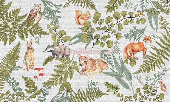 Fototapeta z nowoczesną grafiką, w dotyku lekko chropowata, sprawia wrażenie głębi i przestrzeni tworząc efekt 3D. Wśród paproci, liści i czerwonych muchomorów, znajdują się ulubione przez dzieci zwierzęta: zając, lis, wiewiórka, sarenka, borsuk, sowa, mała żabka i mysz. Fototapeta w spokojnych kolorach, stworzy w pokoju malucha przytulną atmosferę, będzie doskonałym tłem dla dziecięcego świata zabaw i wyobraźni.
