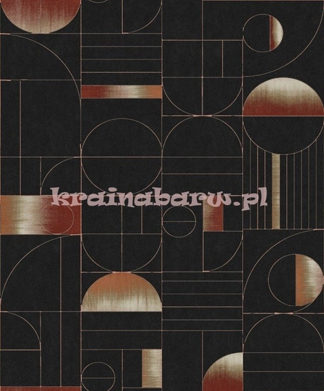 rolka ma długość 10,05m, szerokość 53cm, oraz przesunięcie wzoru co 64cm. Modna nowoczesna tapeta z czarnym matowym tłem, wzór atrakcyjnych, miejscami dyskretnie połyskujących rdzawych linii, tworzy geometryczne schematy, koła, elipsy, częściowo wypełnione kolorem rdzawego brązu, szarości. Wysokiej jakości tapeta z efektowną grafiką, z wyrafinowaną elegancją ozdobi wnętrza w stylu minimalistycznym, nowoczesnym, industrialnym. To również doskonałe uzupełnienie wzorów z kolekcji PRISMA Khroma by Masureel