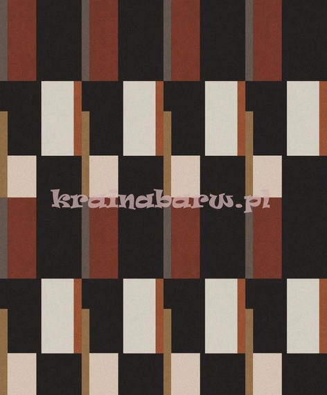 rolka ma długość 10,05m, szerokość 53cm, oraz przesunięcie wzoru co 32cm. Prosty, abstrakcyjny geometryczny wzór, z odważnym układem matowych prostokątów: czarnych, mahoniowych, rudych, kremowych. Wzór został miejscami wzbogacony, subtelnie połyskującymi metalicznie prostokatami. Luksusowa, pełna elegancji tapeta, zainspirowana malarstwem Pieta Mondriana, idealnie wpisuje się do współczesnych nowoczesnych wnętrz, tworząc na ścianie spektakularny efekt.