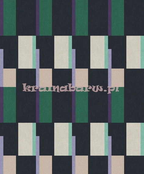 rolka ma długość 10,05m, szerokość 53cm, oraz przesunięcie wzoru co 32cm. Prosty, abstrakcyjny geometryczny wzór, z odważnym układem matowych prostokątów:w głębokim, ciemnym granacie, fioletach, zieleniach, beżach. Wzór został miejscami wzbogacony, połyskującymi metalicznie prostokątami. Luksusowa, pełna elegancji tapeta, zainspirowana malarstwem Pieta Mondriana, idealnie wpisuje się do współczesnych nowoczesnych wnętrz, tworząc na ścianie spektakularny efekt.