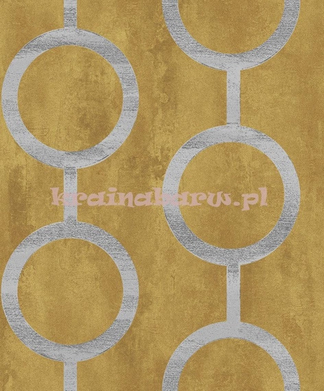 rolka ma długość 10,05m, szerokość 53cm, oraz przesunięcie wzoru co 64cm. Modny geometryczny wzór z motywem połączonych ze sobą dużych kół, obręczy o średnicy 23cm. Wzór umieszczony na prostym, lekko przecieranym tle, przypominającym surową betonową ścianę, tworzy we wnętrzu imponujące wrażenie. Piękne, nowoczesne połączenie kolorów żółto-złotego, i metalicznego szarego, daje spektakularny efekt. Doskonałej jakości wyrafinowana tapeta to eleganckie wykończenie salonu, gabinetu, sypialni i innych prestiżowych miejsc.